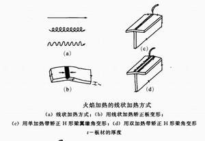 線狀加熱即帶狀加熱,加熱帶的寬度不大于工件厚度的0.5至2.0倍。由于加熱后上下兩面存在較大的溫差,加熱帶長度方向產生的收縮量較小,橫方向收縮量較大,因而產生不同收縮使鋼板變直,但加熱紅色區的厚度不能超過鋼板厚度的1/2,常用于H型鋼構件翼板角變形的糾正。