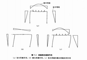 當(dāng)把一個框架轉(zhuǎn)換為一個剛性框架時,其主要目的是為了保證側(cè)向穩(wěn)定,剛性框架對豎向荷載的反應(yīng)不可避免地改變了。在圖7.1 (a)所示框架中,豎向荷載作用于梁上時,柱(穩(wěn)定或不穩(wěn)定)僅承受豎向軸向壓力,當(dāng)柱與梁連接產(chǎn)生剛性框架作用時,柱還承受彎曲。豎向荷載和側(cè)向荷載共同作用下框架作用如圖7.2 (c)所示。