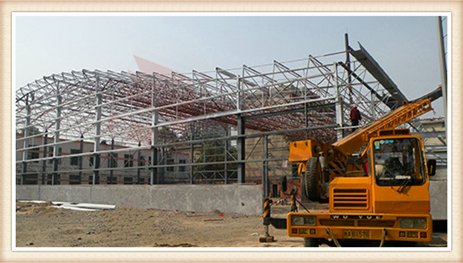 網(wǎng)架矢高1.75M,屋面外板采用通長(zhǎng)760型(內(nèi)板900型)壓型彩鋼板。