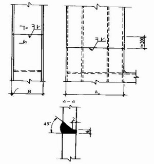 上圖是大尺寸箱形柱的焊接接點。一般將腹板與翼板的拼接位置錯開200mm左右,主要的焊接工作在外部完成,僅在柱里邊進行焊縫的封底工作,有條件時,可以采用氣體保護的自動焊接。這種焊接的接點也可以認為與主材等強,不必再另行計算。
