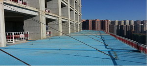 在外框周邊沿外框梁、柱搭設(shè)內(nèi)高外低的平網(wǎng)防護(hù)措施,保證臨邊作業(yè)人員的安全,同時(shí)防止物料墜落傷人。根據(jù)現(xiàn)場施工進(jìn)度情況,每隔6層一道,始終保持2道安全挑網(wǎng)防護(hù)。